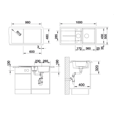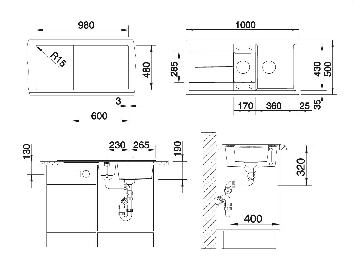 Габариты: 1000*500 мм, 1,5 чаши: 360*430*190 мм + 170*285*145 мм+ сушка