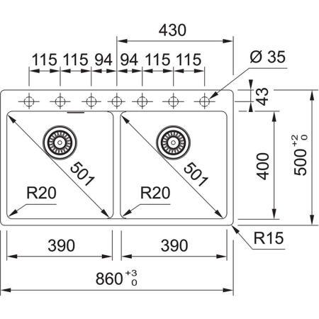 Габариты: 860*500 мм, 2 чаши: 390*400*200мм