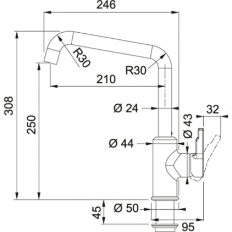 Высота излива 308мм, вылет 246мм, керамический дисковый картридж