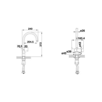 Отдельные рычаги управления для фильтрованной и нефильтрованной воды; один совмещенный излив для питьевой и водопроводной воды с разделением рассекателя